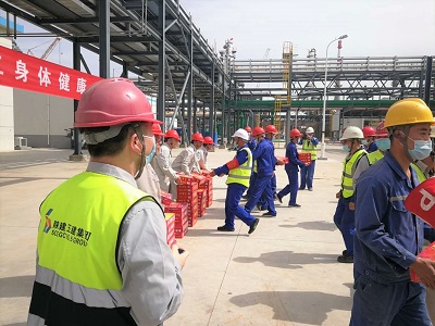 近日,陕建集团党委常委、董事,延长化建党委书记高建成,延长化建董事、党委副书记符杰平,延长化建总经理康宇麟,延长化建总法律顾问郑发龙一行,来到乐竞网页版入口总承包项目榆能化一期填平补齐工程现场,进行了暑期慰问和视察。