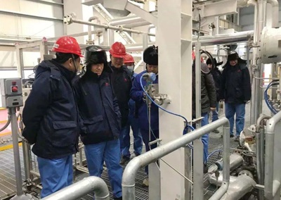 许缄涛首先来到甲醇联合装置施工现场进行了视察。先后到甲醇合成精馏、气化、灰水处理、变换、低温甲醇洗等单元进行了查看,听取了相关负责人项目情况介绍,并对项目试车运行、技术保障等情况进行了详细询问。许缄涛对项目组工作表示肯定,并强调要全力做好现场防冻防凝工作,针对冬季带来的不利因素,要进一步强化现场管理,严格执行施工程序和标准,细化工作方案,在确保安全质量受控的前提下,为业主投料开车做好保驾护航工作。