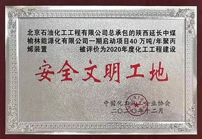 近日,从中国化工施工企业协会传来喜讯,由公司总承包的榆能化一期启动项目填平补齐工程甲醇联合装置2线和40万吨/年聚丙烯装置被授予“2020年度化工工程建设安全文明工地”称号。