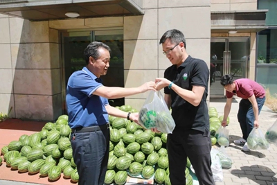公司党委副书记、工会主席、职工董事景建民将西瓜发到员工的手里,并嘱咐大家在坚守岗位的同时,注意劳逸结合,防暑降温,增强自我保护意识。