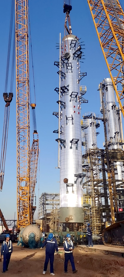 据悉,该塔是甲醇联合装置最高、最重的设备,塔分三段到场,本次吊装的为该塔下段,由850吨履带吊主吊,450吨履带吊溜尾,接下来将完成下段环缝的组对焊接,为中、上段安装创造条件。