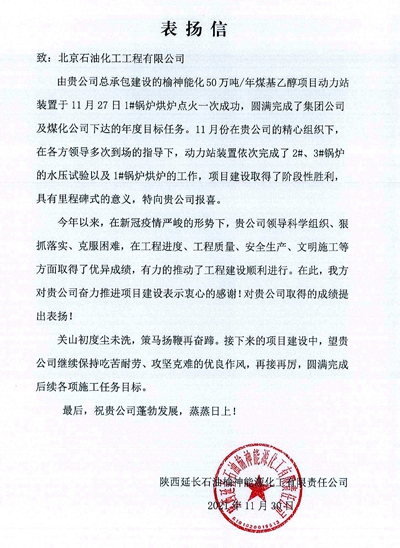 近日,延长石油榆神能化公司发来表扬信,对乐竞网页版入口总承包的50万吨/年煤基乙醇项目动力站装置1号锅炉烘炉点火一次成功表示祝贺和感谢。据悉,1号锅炉于11月27日低温烘炉点火成功,该锅炉生产蒸汽能力达286吨/小时。目前,动力站3台锅炉试压工作已圆满完成,为项目中交奠定了坚实基础。