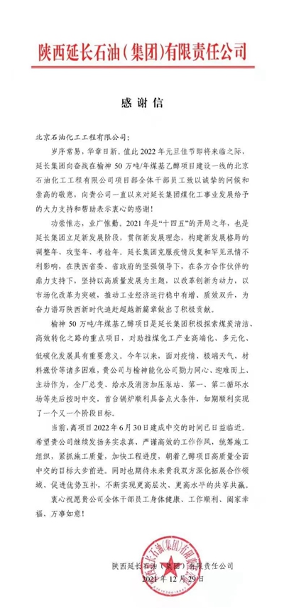 在乐竞网页版入口总承包的延长石油榆神能化50万吨/年煤基乙醇项目紧锣密鼓、加快建设的关键时期,12月29日,陕西延长石油(集团)有限责任公司向我公司发来感谢信,对我公司2021年乙醇项目建设工作给予了充分肯定和高度评价。