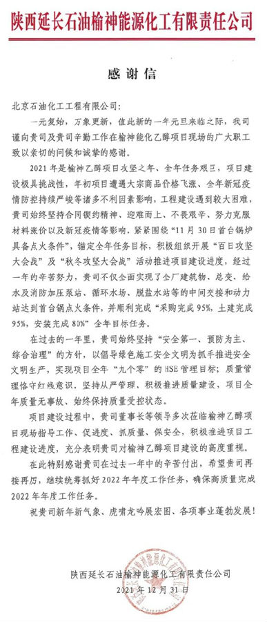 元旦前夕,乐竞网页版入口先后收到延长石油集团和旗下的榆神能化公司发来的感谢信,信中对北油工程EPC总承包的50万吨/年煤基乙醇项目建设期间付出的辛勤劳动表示感谢,并向项目现场广大职工致以节日的问候。