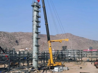 近日,由乐竞网页版入口EPC总承包的内蒙东景BDO项目丁二醇主装置低沸塔缓缓起吊,经过2个小时的紧张施工,稳稳地吊装到指定位置上。