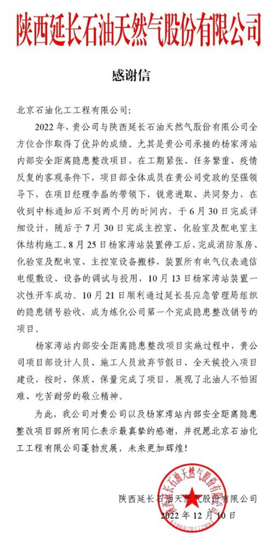 近日,乐竞网页版入口收到来自陕西延长石油天然气股份有限公司的感谢信,对我公司总承包的杨家湾站内部安全距离隐患整改项目在建设期间精心策划、合理安排施工、克服不利因素,保质保量按期完成了任务目标,得到了业主的肯定。