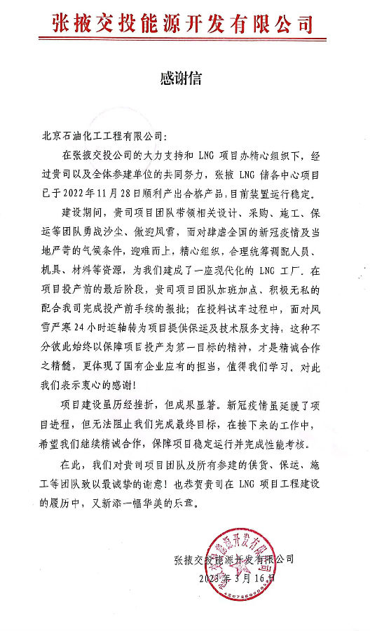 近日,乐竞网页版入口(简称:北油工程)收到张掖交投能源开发有限公司发来的感谢信,对张掖LNG储备中心项目建设成果表示了肯定,对我公司项目团队表现出的技术专业性及不畏艰难、勇于担当的团队精神表示了感谢。