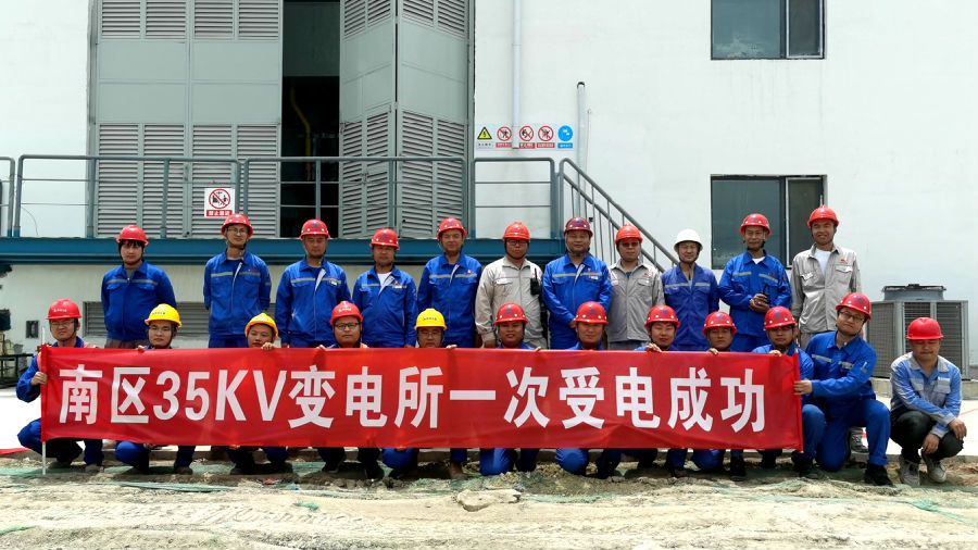 南区35kV变电所内设35kV和10kV配电装置、2台31500kVA 35/10kV主变、6台2500kVA干式变压器和低压配电柜,为南区所有装置、辅助设施及公用工程单元用电设备供电,其两回路电源分别来自110kV正泰甲醇变电站及110kV正泰临白变电站,通过35kV电缆接至变电所内35kV开关柜。建设期间,项目组精细化管理,有效控制设备订货、巡检催交、设备安装及调试等环节,为本次一次受电成功打下坚实的基础。