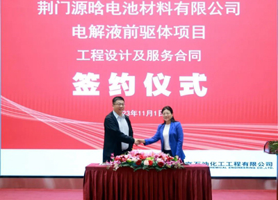 11月1日,荆门源晗电池材料有限公司(简称:荆门源晗)电解液前驱体项目工程设计及服务合同签约仪式在乐竞网页版入口(简称:北油工程)举行。荆门源晗公司总经理周虎,北油工程公司党委副书记、总经理田伟代表双方签署协议。