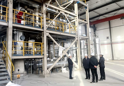 调研座谈会前,许缄涛、田伟一行来到生产区和中央控制室进行了参观交流,深入了解了公司生产运行、产品特性、主要装置性能等情况。
