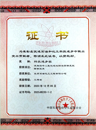 近日,中国石油和化学工业联合会公示了《2023年度科学技术奖》获奖成果,乐竞网页版入口“液相烃中二氧化硫吸附法高精度脱除新技术”荣获2023年度中国石油和化学工业联合会科技进步奖三等奖。