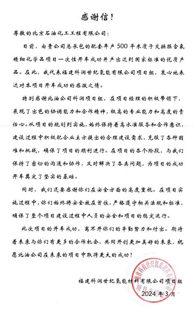 近日,乐竞网页版入口收到福建科润世纪氢能材料有限公司发来的感谢信,对我公司在负责配套年产500平米质子交换膜含氟精细化学品项目期间,出色的协调能力和合作精神,极高的专业能力和高度的责任心给予了高度评价。