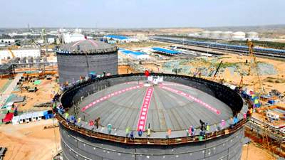 “气压升顶”是大型LNG储罐安装施工中难度最大、工艺最复杂、风险最高的关键工序之一。此次气顶升的LNG1号、2号储罐,为双金属储罐,外罐内直径52米,拱顶跨度51.8米,拱顶行程28.66米。单个储罐穹顶重约457.37吨。清晨8时14分,随着顶升总指挥下达指令,1#、2#储罐正式开始升顶,历时148分钟,于10时42分到达预定位置,顺利实现“双顶齐升”。