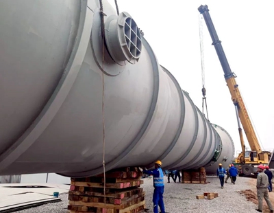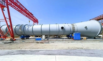 作为项目的关键设备,电子级乙醇塔直径达4.8米,高度约110米,总重约450吨;脱轻塔和脱重塔长度均超过60米,属超限设备,需分段运输并在现场组对安装。为确保设备安全卸车,项目组精心策划,采用300吨+250吨双机抬吊方案,并在吊装前严格进行设备检验、安全交底及联合检查,顺利完成超限设备短驳任务。