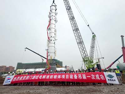 作为项目的关键设备,电子级脱轻塔采用隔板填料塔设计,主要用于脱除无水乙醇中的氢、氮及乙烷反应中的轻杂质组分。该塔直径3.5米,总高约102米,设备及内件总重约410吨。考虑到运输和安装难度,设备在工厂分三段预制后运至现场,采用"分段吊装+空中组对"进行安装。为确保安全,项目组采用800吨+400吨双机抬吊方案,并严格执行设备检验、安全交底等程序。