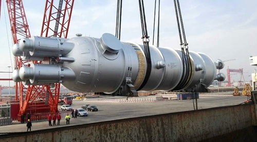 据了解,该设备采用目前世界上最先进的英国davy公司中压甲醇合成工艺技术,并由韩国Doosan公司制造,净重347吨、长26米、最大直径3.7米,单体产能达180万吨/年。这个“庞然重器”历经4个多月的时间终于从天津港运抵项目现场。