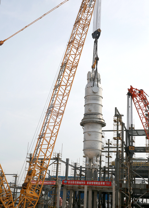 8月17日上午,随着信号工指令,公司延能化项目重达347吨的甲醇装置首台合成塔缓缓起吊,经过3个小时的起吊调试,合成塔准确吊装在预定位置。
